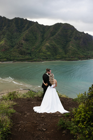 The couple might have set the record for highest number of times changing outfits on a wedding day. After getting dressed at their hotel in the morning, they changed out of their wedding attire to wear hiking clothes, then at the top of the hike they changed back into their wedding attire, only to change OUT of it again after the ceremony for the hike back down! If you thought they were done there-- nope-- they had one more outfit change on the agenda for their time at the beach. Absolute troopers.