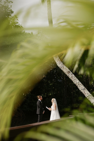 Some days just feel like magic from the start. This sweet couple kicked off their elopement day tucked away in a lush, jungle-y hotel on the east side of O'ahu—quiet, green, and full of tropical charm. After getting ready, they shared a quiet first look on a dock over calm waters—just the two of them, surrounded by nature. Palm trees, birdsong, and soft morning light setting the tone. It was quiet and calm, the kind of peaceful that invites you to just breathe it all in.